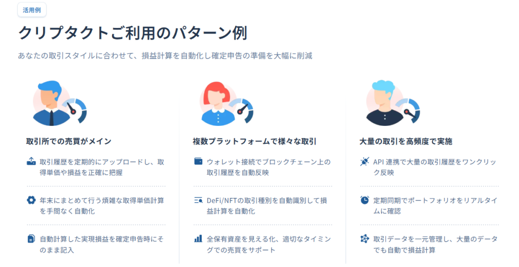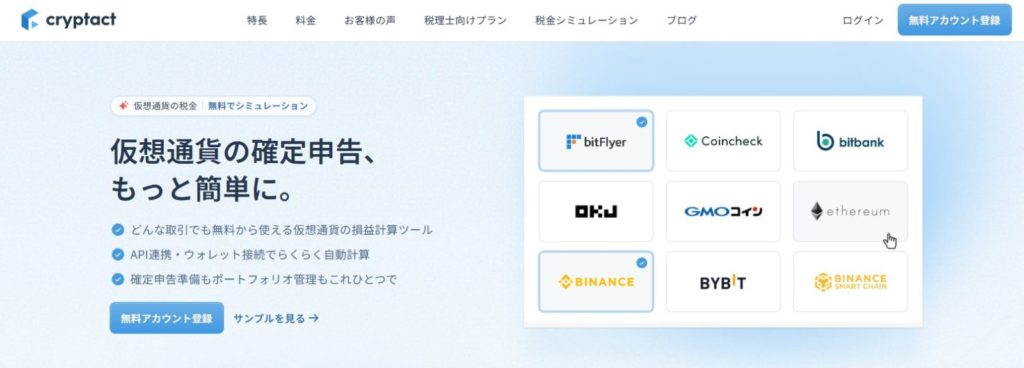「クリプタクト(Cryptact)」 は、国内ユーザーが最も多く利用している暗号資産の 損益計算ツール です。