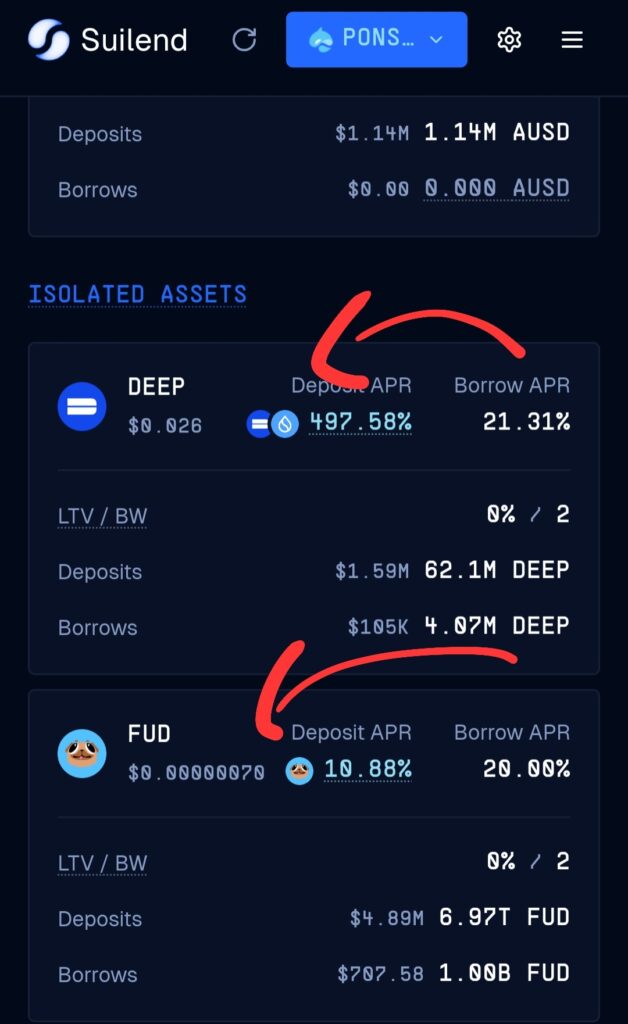 Deposit APRが利率になります。珍しいのはFUDというミームコインがある点。